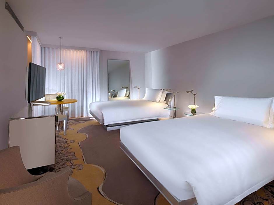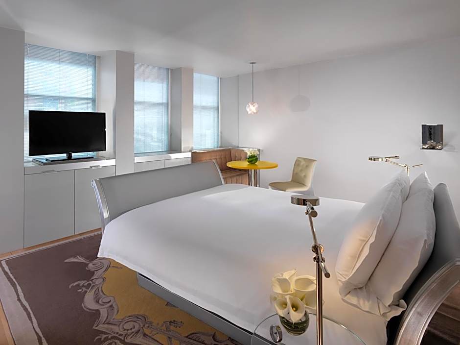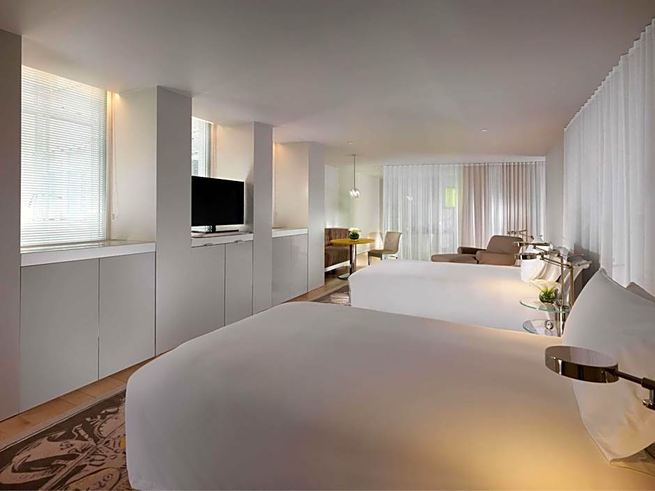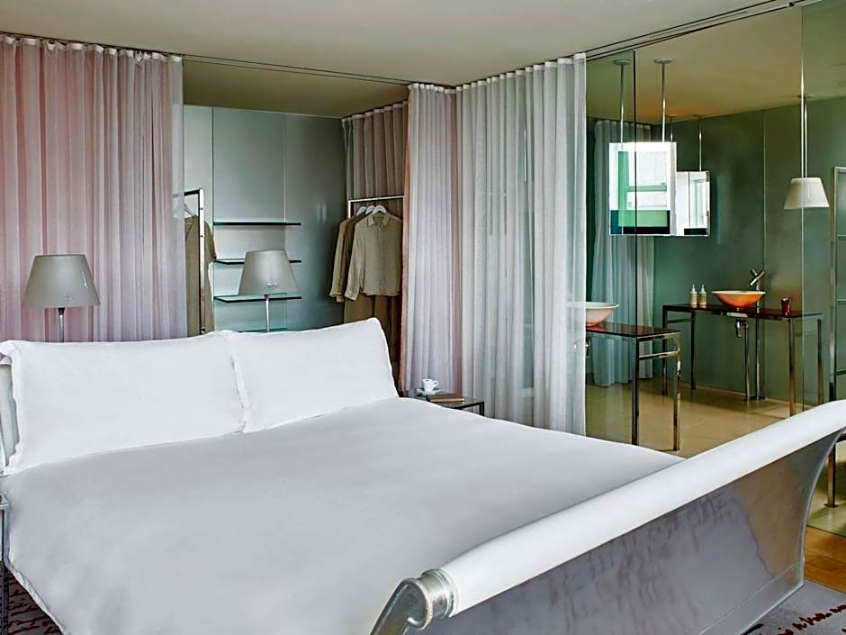 Features a silver-leaf sleigh bed, elegant swan chair, glowing mirror and a hand-woven rug inspired by Voltaire’s handwriting. The private bathroom and dressing room are encased in a glowing floor-to-ceiling glass box that is wrapped in layers of sheer curtains.